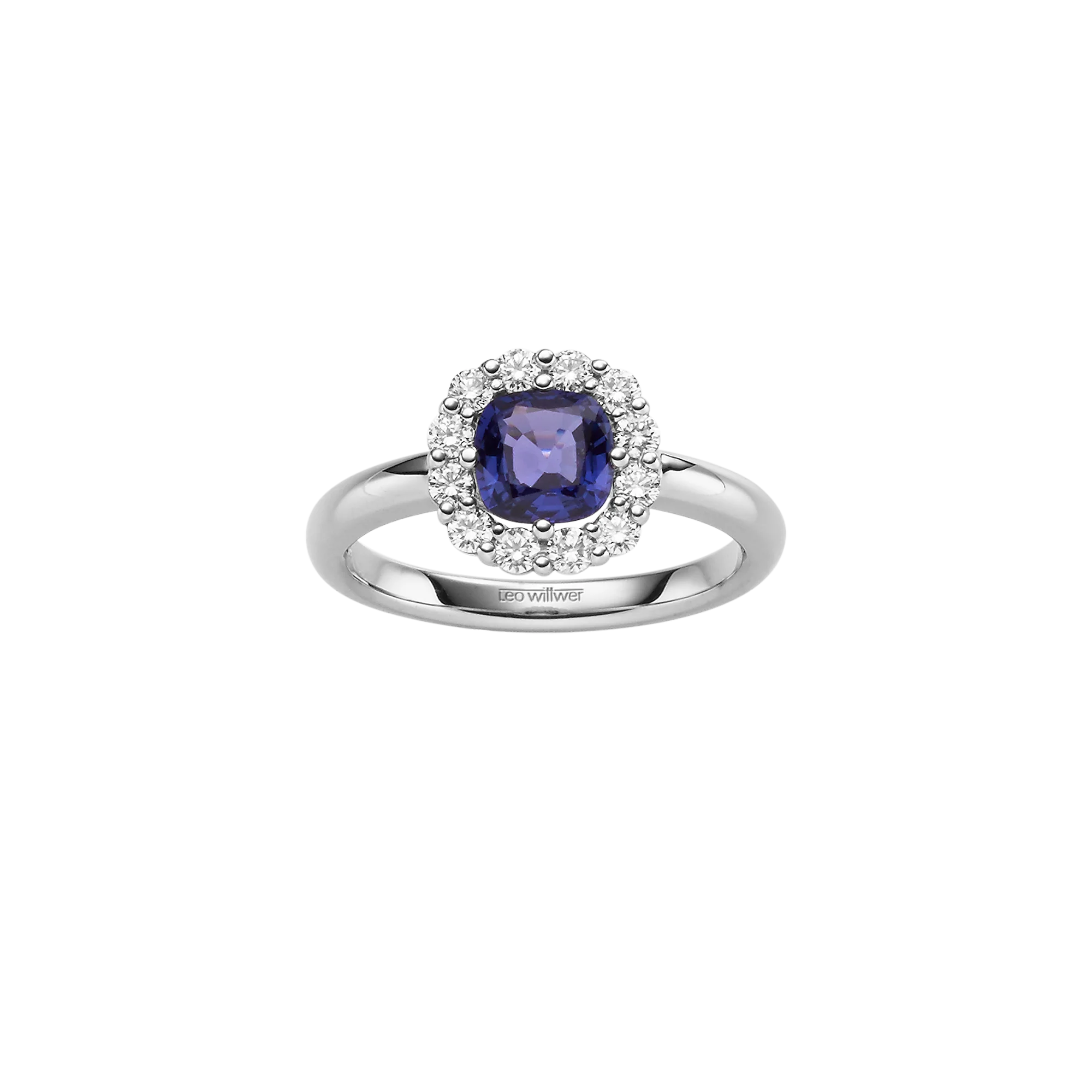 Dieser violette Saphir von 0,99Ct im Kissenschliff wird durch 12 wunderschöne