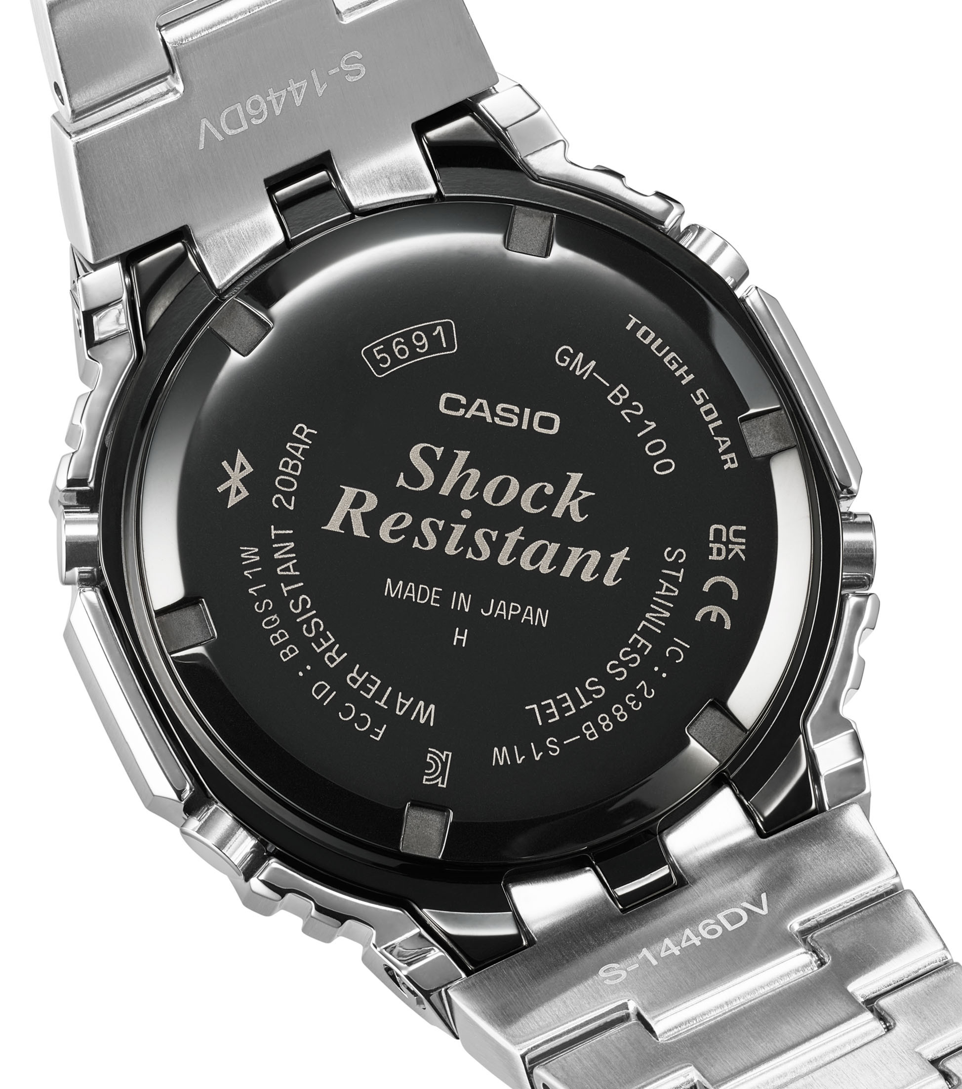 Zwischen der Lünette und dem Gehäuse befinden sich Pufferkomponenten aus feinem Kunstharz, während eine dreizackige Konstruktion die Verbindung von Metallband und Gehäuse sichert und Stöße auf die Verbindungshülsen verteilt. Dies verleiht dem Zeitmesser aus Vollmetall die Stoßfestigkeit einer G-SHOCK. Die Gehäuserückseite ist mit einer Schraubensicherung versehen, die eine feste Abdichtung gewährleistet.