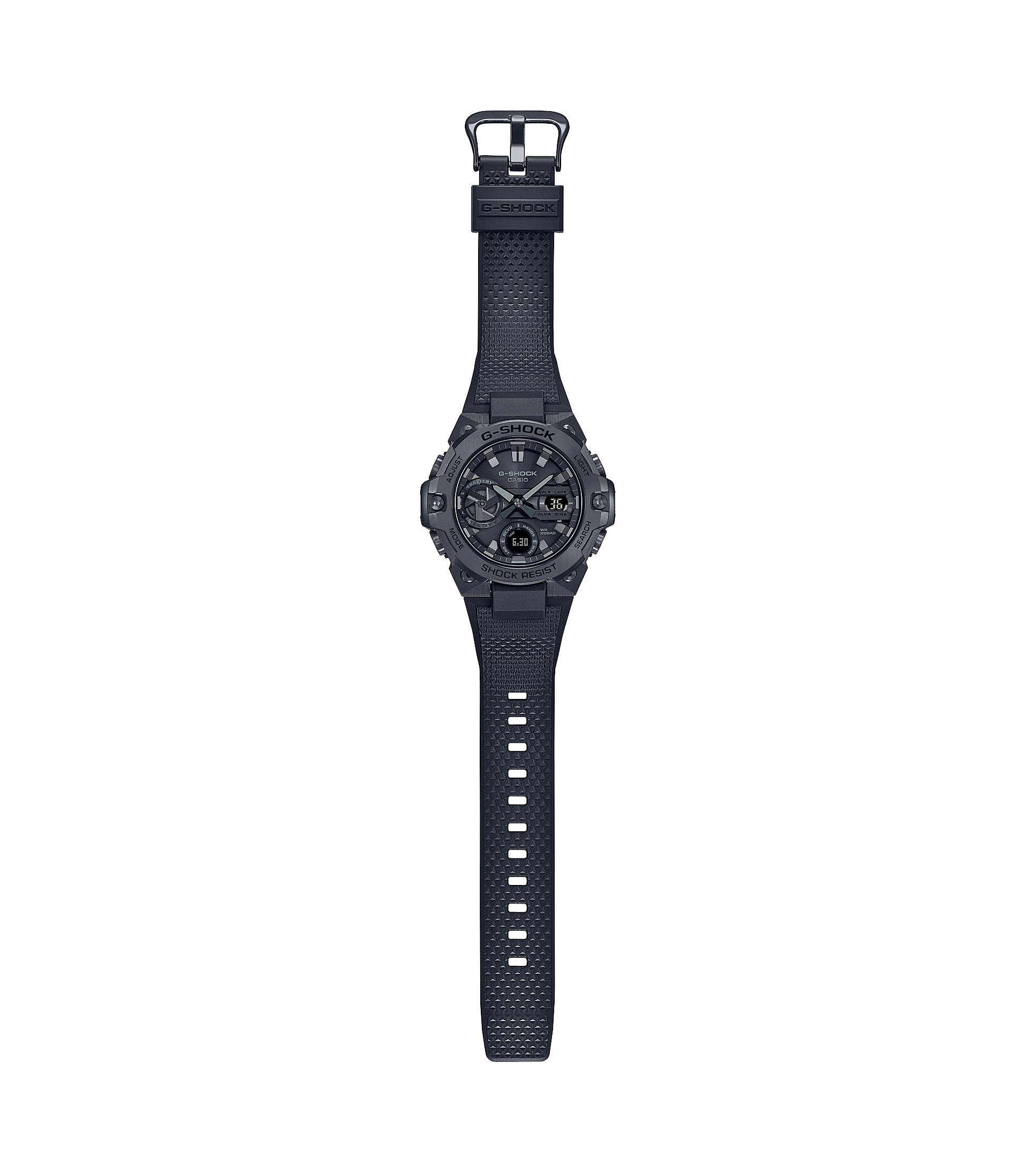 Mit der GST-B400BB-1AER bringt G-SHOCK ein kraftvolles Fashion-Statement im tiefschwarzen Look: Ionenplattiertes Metall trifft auf Carbon Core Guard – ultrarobust, ultraflach und dank Tough Solar, Bluetooth® und Super Illuminator auch technologisch top aufgestellt. Ob im Alltag oder beim City-Workout – dieses Modell kombiniert kompromisslose Widerstandsfähigkeit mit minimalistischer Coolness.