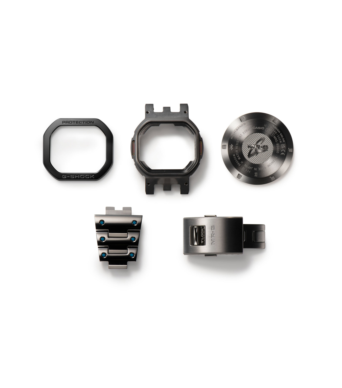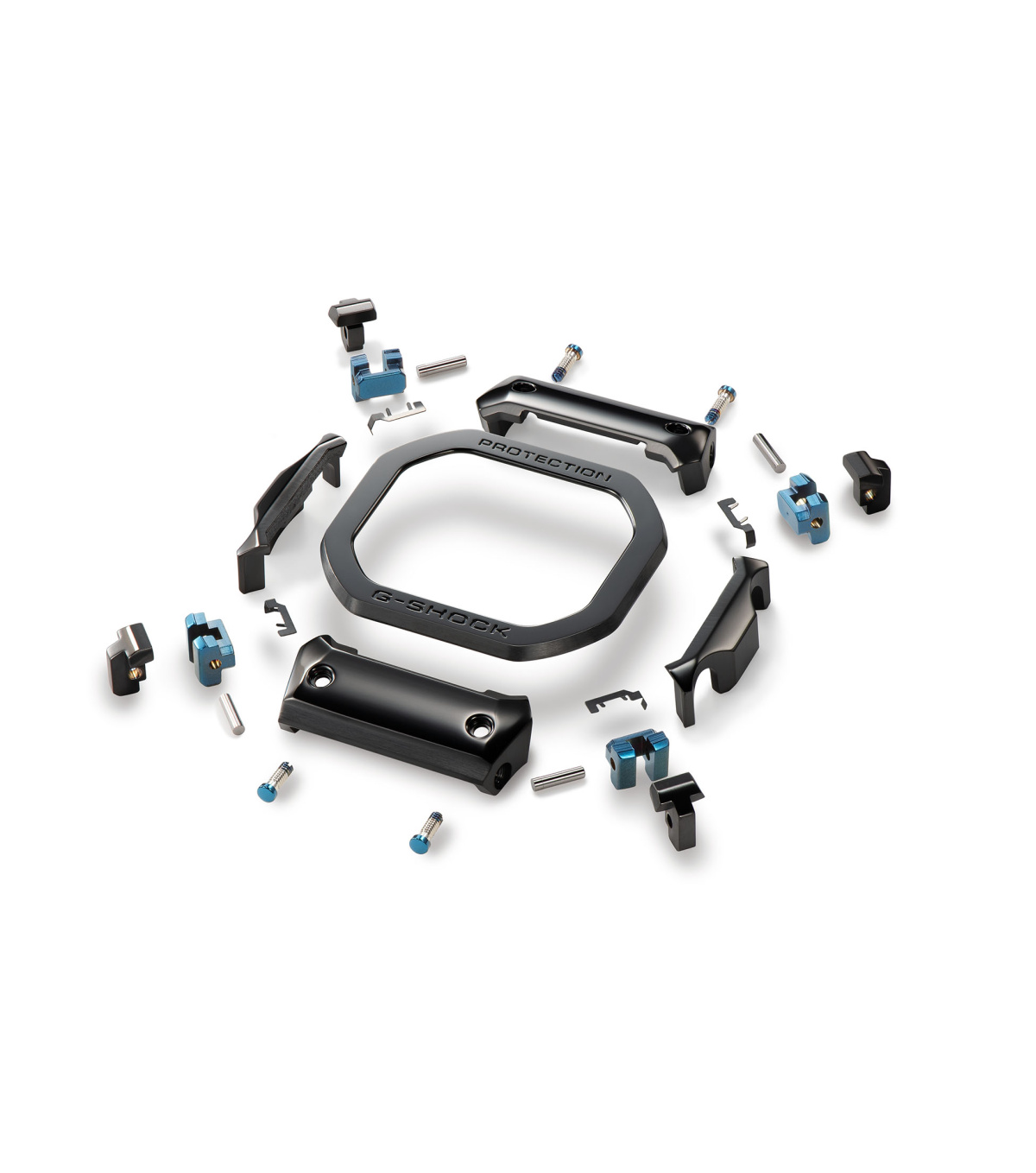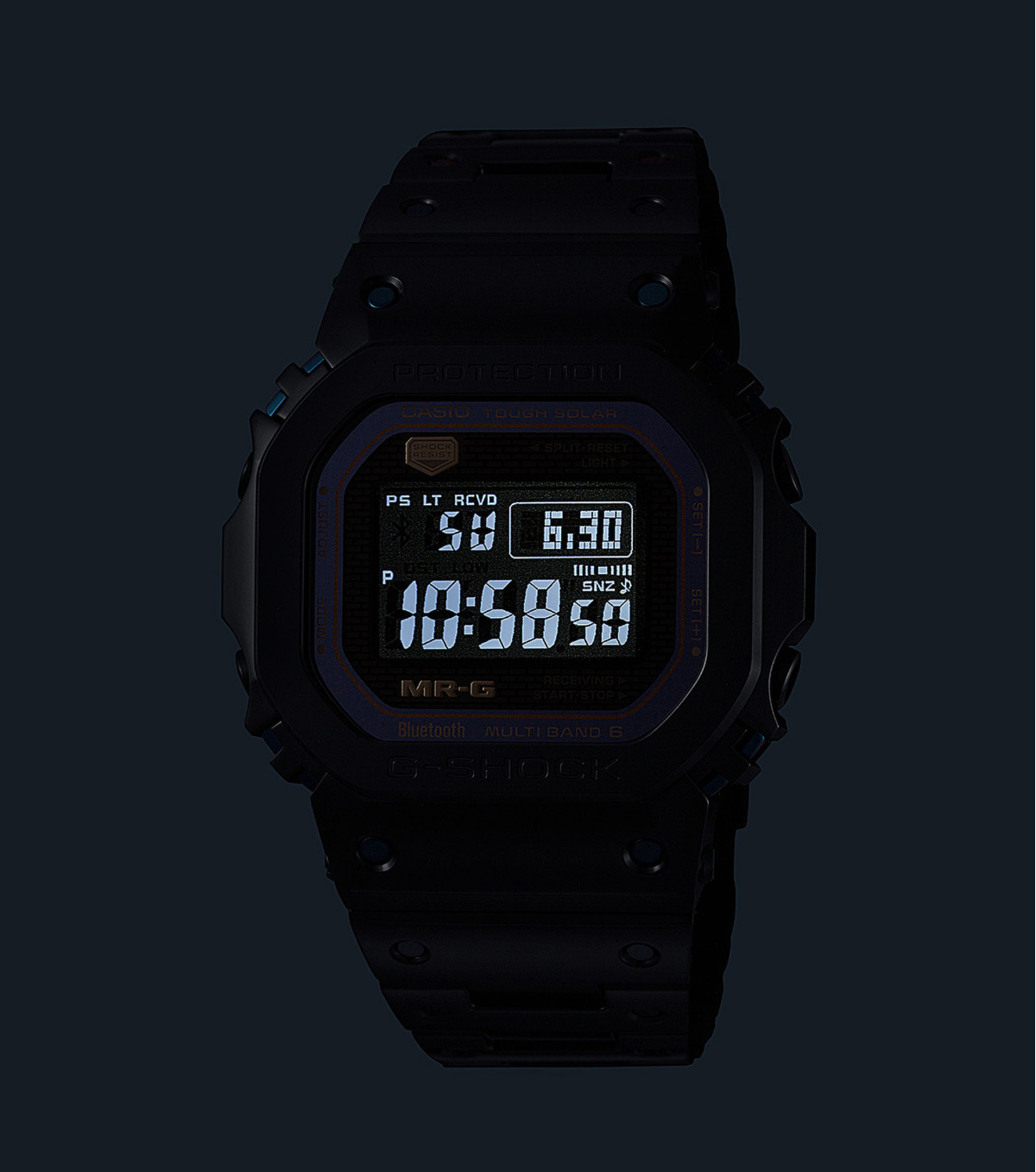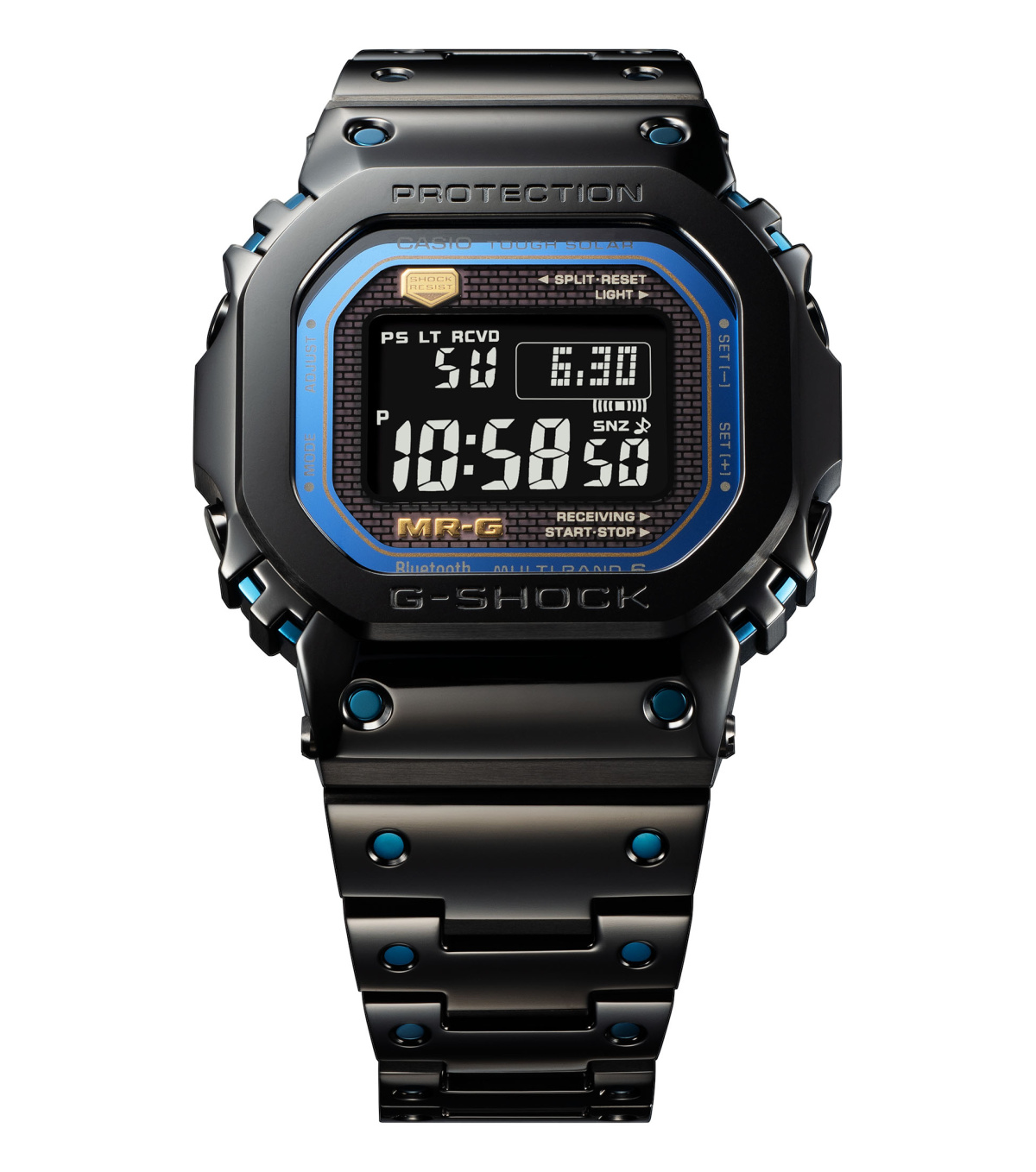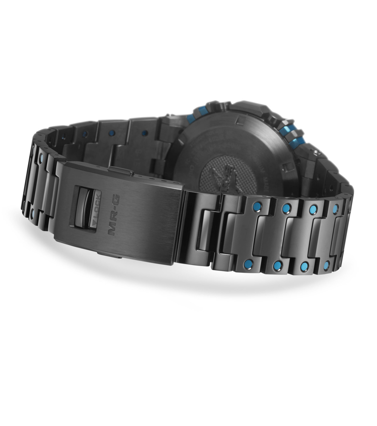 Willkommen bei der Casio G-Shock MRG-B5000, einem Meisterwerk, das auf dem ersten G-SHOCK-Modell basiert und mit hochmodernen Materialien und Hochglanz-Oberflächen gefertigt wurde, die das Markenzeichen der MR-G Flaggschiff-Linie sind. Dieses bahnbrechende Design ist eine Hommage an die Kunst der Metallverarbeitung. Das Gehäuse und die Lünette bestehen aus einer superharten Titanlegierung auf Ti64-Basis, während das Band aus der speziellen Titanlegierung DAT55G gefertigt ist, die dreimal härter als reines Titan ist und sich hervorragend bearbeiten lässt. Die Oberseite der Lünette ist aus COBARION gefertigt, einer Kobalt-Chrom-Legierung, die viermal härter ist als reines Titan. Die Lünette allein besteht aus 25 verschiedenen Komponenten, die alle einzeln poliert sind und eine atemberaubend detaillierte Textur aufweisen. Die hochmoderne Multi-Guard-Struktur mit flachen Federn und Silikonpuffern in der Mehrkomponenten-Lünette sorgt für eine hervorragende Stoßdämpfung zum Schutz des speziellen G-Shock MR-G-Moduls mit vergoldeter Halteplatte. Inspiriert von Farbwaschungen und Kalligrafie in blauer Tinte, verfügt die MRG-B5000BA über Armbandschrauben und Lünettenkomponenten, die sich blau und ionenplattiert von einem schwarzen, diamantartigen Kohlenstoffbeschichtung abheben. Die blaue Dampfbeschichtung verleiht dem Zifferblatt ein markantes Aussehen, und das legendäre Ziegelmuster erinnert an das ursprüngliche G-SHOCK-Design der DW-5000. Diese metallischen Schönheiten überzeugen auch in Sachen Funktion, mit funkgesteuerter Kalibrierung und Smartphone-Kopplung über Bluetooth®.