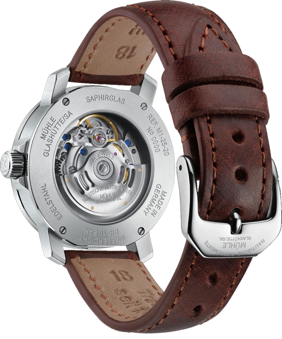 - Gehäuse: Edelstahl, entspiegeltes Saphirglas, Boden mit Sichtfenster, verschraubte Krone