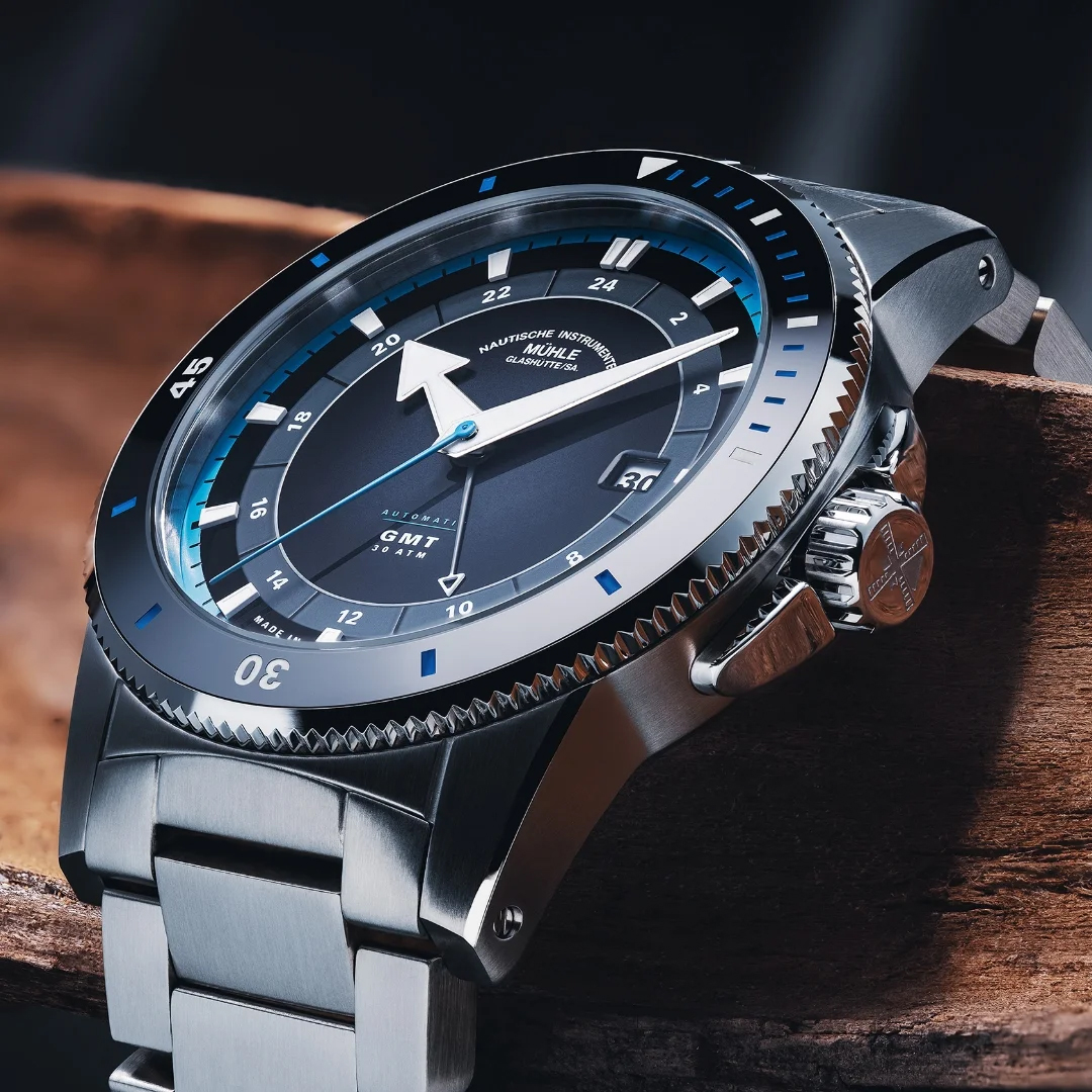 Die neue Sportuhren-Familie von Mühle-Glashütte, zu der die Sportivo Travel GMT gehört, zeichnet sich durch Sportlichkeit, Zuverlässigkeit und Stilsicherheit aus. Ob Outdoor-Abenteuer oder Business-Meeting, diese Uhren vereinen Dynamik und Eleganz. Das Edelstahlgehäuse mit beidseitig drehbarer Keramiklünette und das entspiegelte Saphirglas unterstreichen den sportlich-robusten Charakter der Uhr.