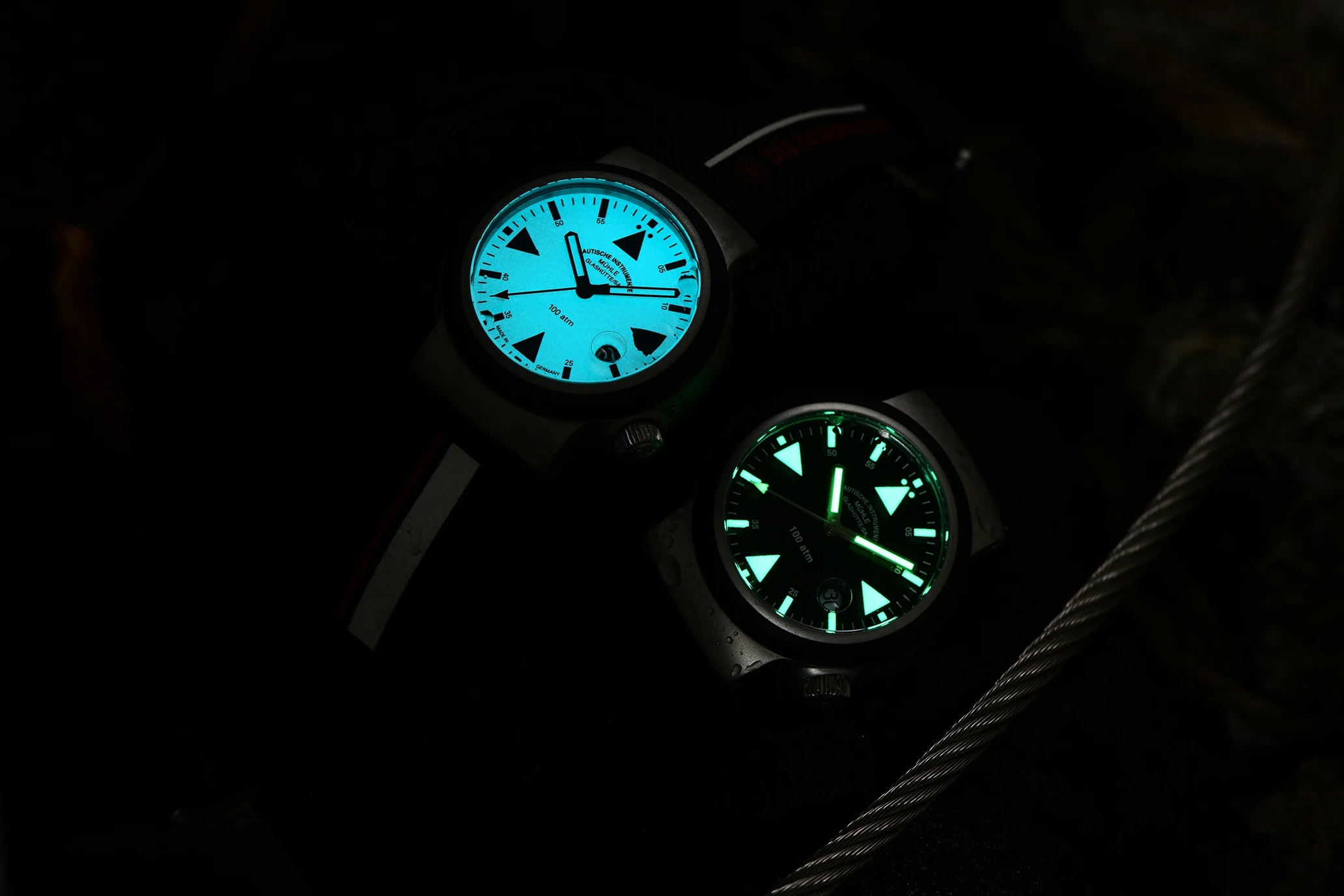 Das Zifferblatt ist komplett mit Super-LumiNova belegt, was für beste Ablesbarkeit auch bei Nacht sorgt. Die Zeiger sind schwarz lackiert und skelettiert, um einen klaren Kontrast zu bieten. Die von Mühle-Glashütte entwickelte Spechthals-Feinregulierung sorgt für außergewöhnliche Robustheit und Stoßsicherheit des Uhrwerks. Das entspiegelte Saphirglas ist mit 4 Millimetern dreimal stärker als ein Standard-Saphirglas und bietet zusätzlichen Schutz.